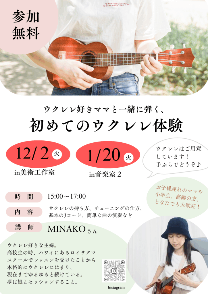 【12月2日(火)・1月20日(火)】ウクレレ好きのママと一緒に弾く、初めてのウクレレ体験