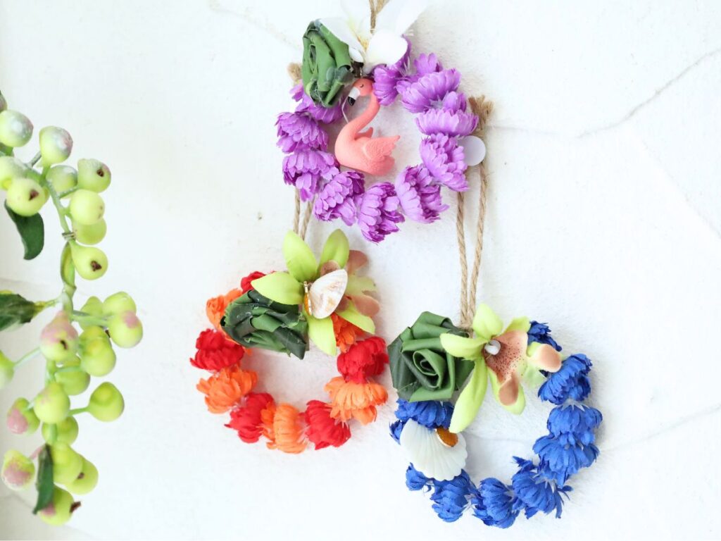 ハワイアンテイストの造花で作る簡単アレンジメントです。壁にかけて飾れます!